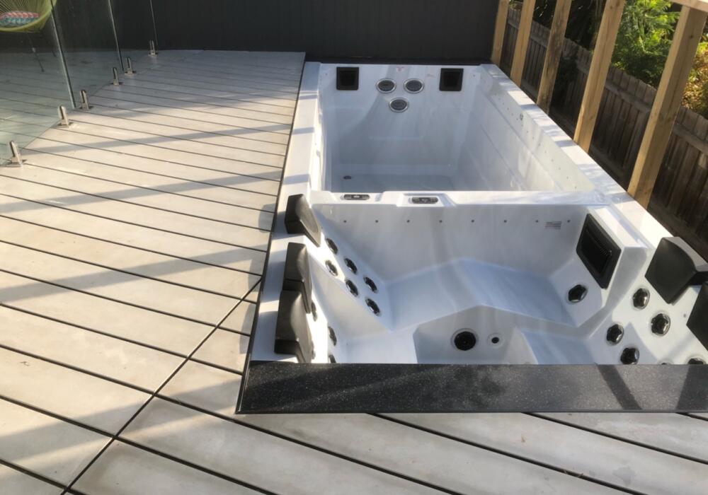 We constructed a subframe and laid composite decking around two sides of the swim spa to give the impression of a swimming pool.