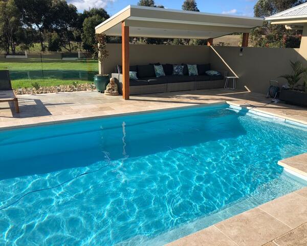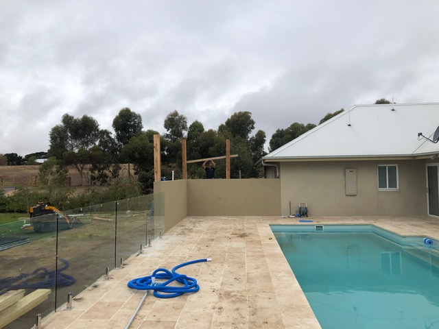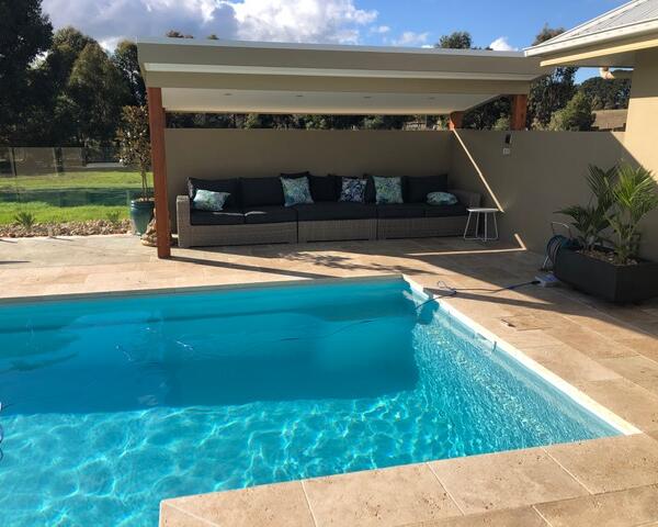 - Pergola: 5m x 2m pergola with raised flat roof using 150mm cypress posts. Includes ceiling with 4 down lights.